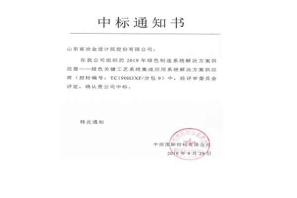 近日,在中華人民共和國工業(yè)和信息化部節(jié)能與綜合利用司2019年綠色制造系統(tǒng)解決方案供應(yīng)商招標中,公司中標綠色關(guān)鍵工藝系統(tǒng)集成應(yīng)用系統(tǒng)解決方案供應(yīng)商。