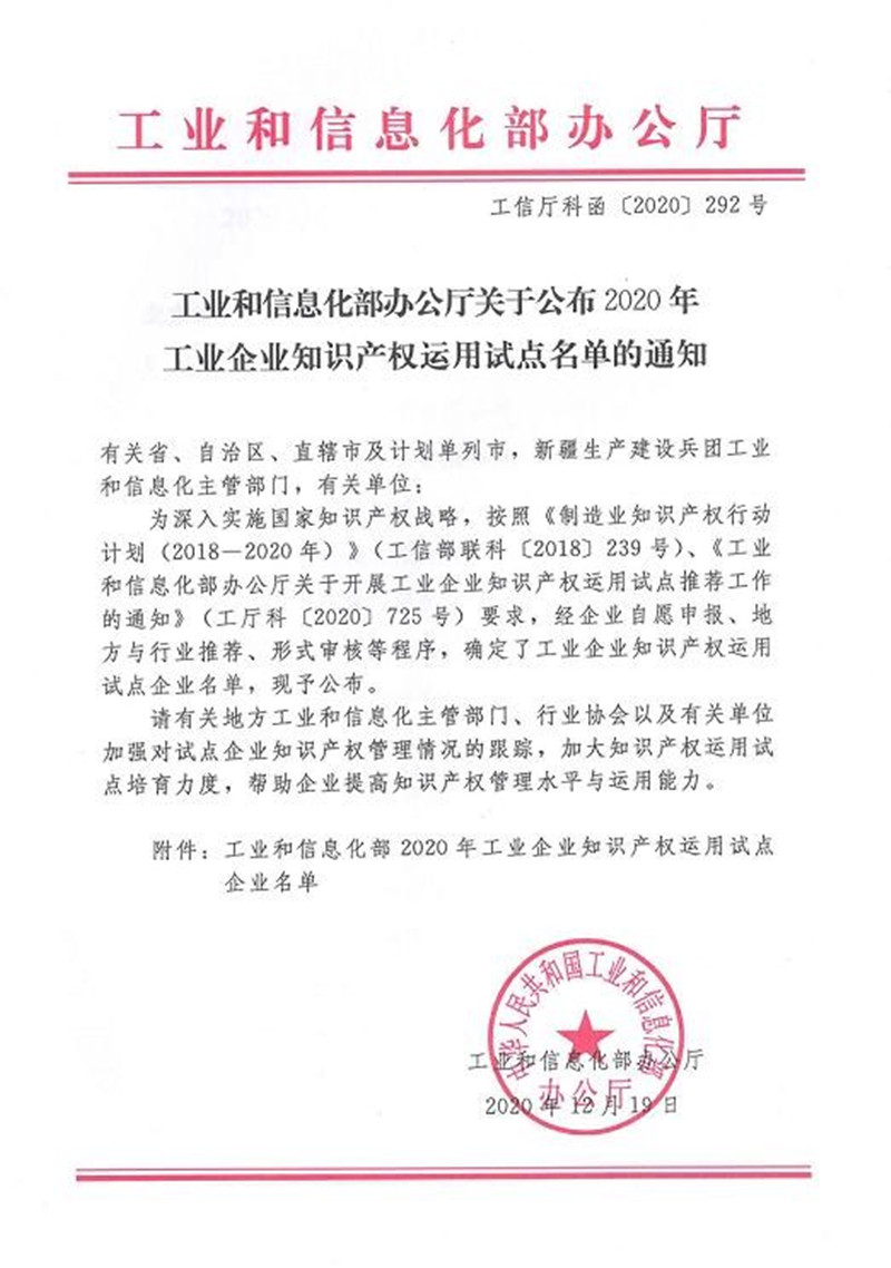 日前,國家工業和信息化部辦公廳發文公布,公司成功入選“2020年工業企業知識產權運用試點單位”,山東省共入選109家知識產權運用優秀企業。