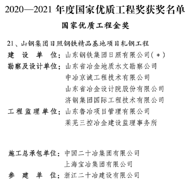 我公司承擔設計的山鋼日照2050mm熱連軋工程于近日獲2020-2021年度國家優(yōu)質工程金獎。