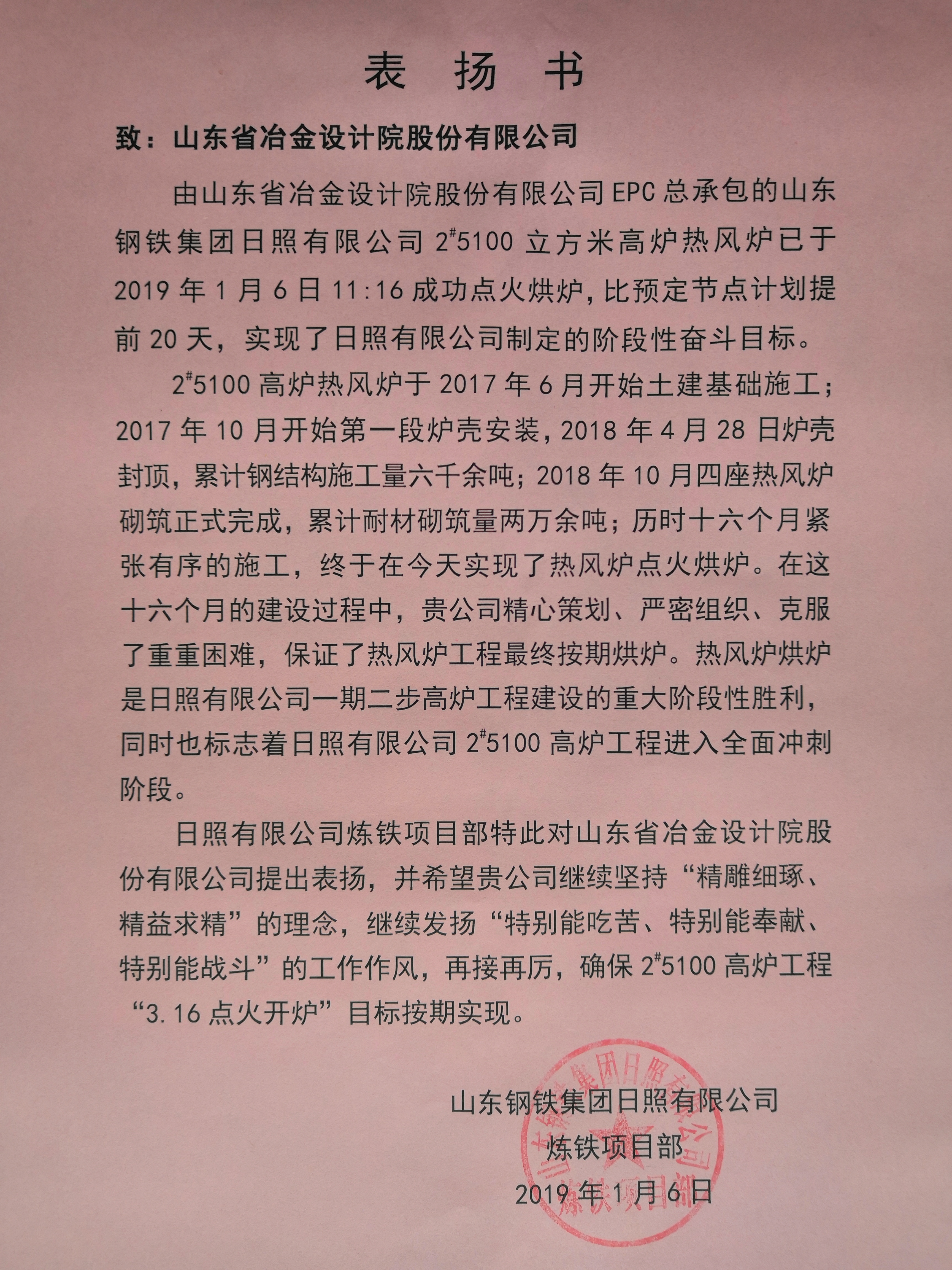 2019年1月6日11時16分,隨著山鋼集團日照公司副總經理王子金:“我宣布山東鋼鐵集團日照精品基地2#5100立方米高爐熱風爐點火烘爐開始”的號令, 由我公司總包的山鋼集團日照精品基地2#5100立方米高爐熱風爐正式點火烘爐。這標志由公司總承包2#5100立方米高爐工程熱風爐烘爐的重大節點比計劃提前20天實現階段性奮斗目標。公司副總經理劉洪亮參加烘爐儀式并發表了講話。當天,山東鋼鐵集團日照有限公司向公司發來了表揚書,贊揚山冶人堅持“精雕細琢、精益求精”的理念,希望再接再厲確保后續工作目標如期實現。
